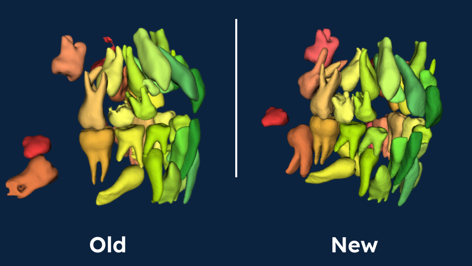 The improvements to the fused teeth include: a smoother transition between the IOS crown and CBCT root, better closing of the crown in the interproximal region, and overall robustness and speed improvements.