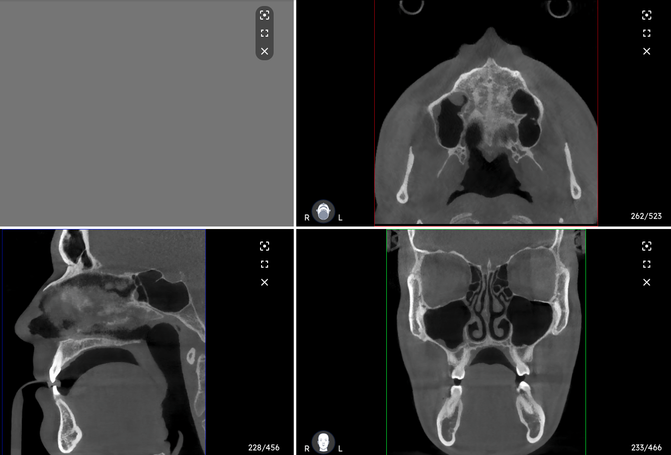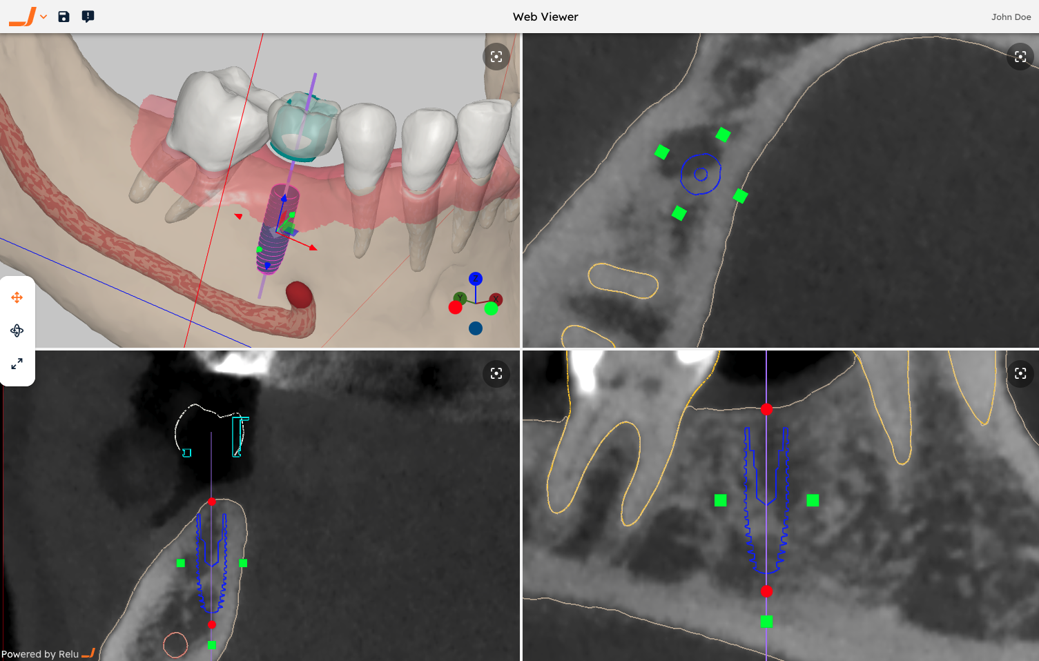 - An implant module (shown on the right), allowing to visualize an automated implant planning proposal. Within the viewer, the end-user can inspect and alter the proposal, adjusting the position, orientation and dimensions of the implants, wax-ups, sleeves and surgical pins - both in 2D and in 3D. We are integrating several implant libraries.