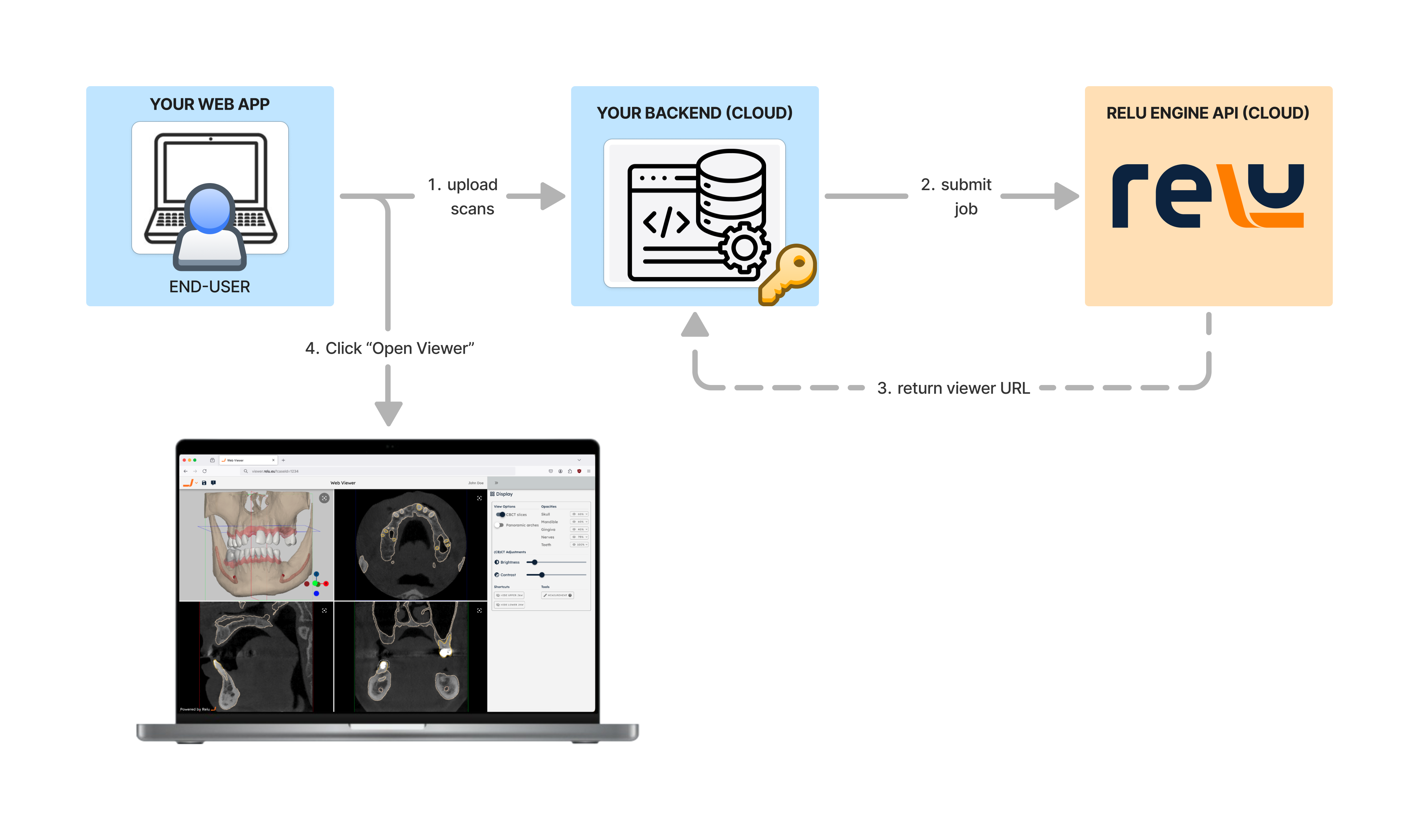 The diagram below illustrates a typical workflow, where the Web Viewer is integrated in your software. This way, your end-users are seamlessly redirected to the viewer, without the need to leave your application.
